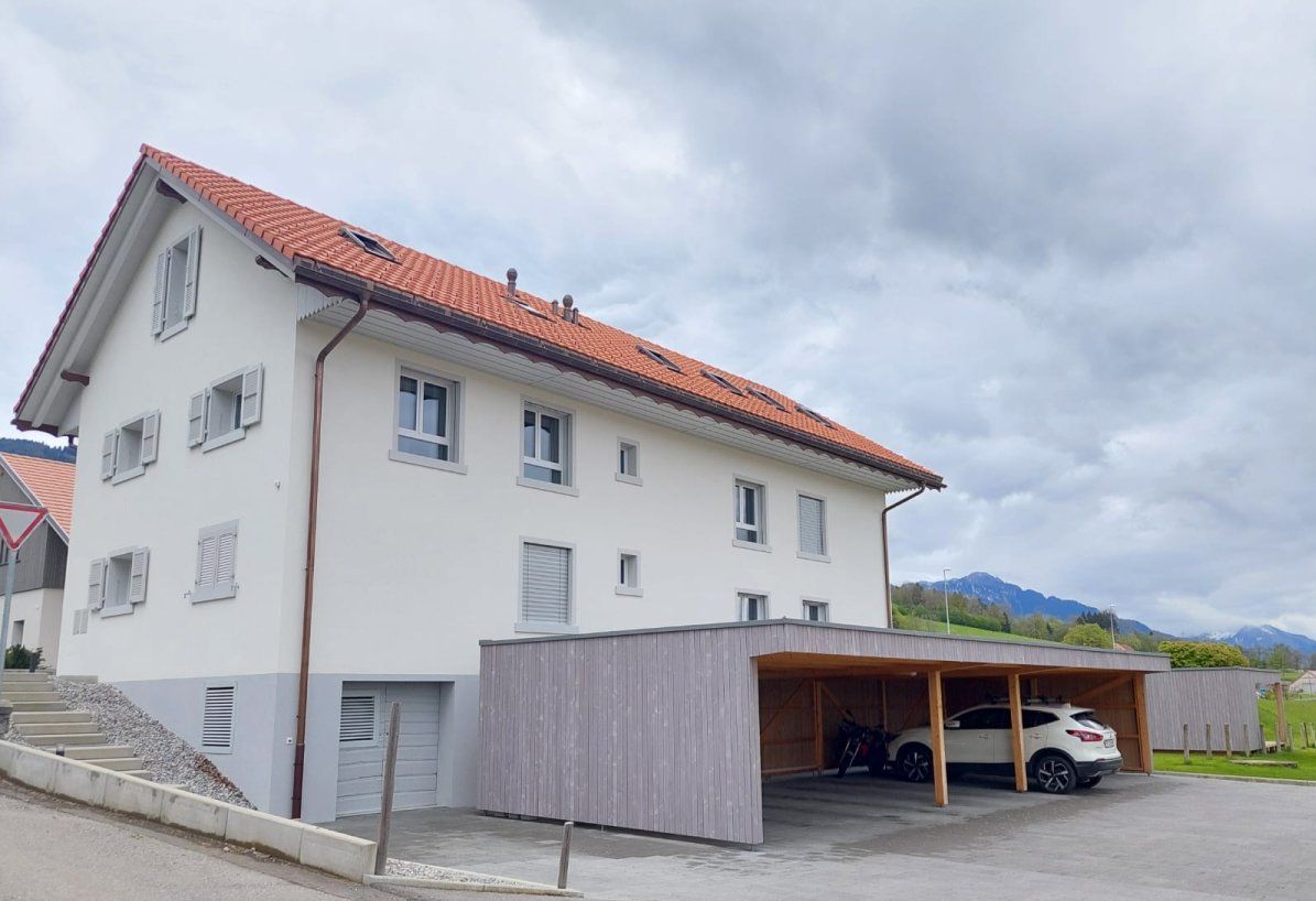 Située dans un quartier résidentiel proche de la belle cité de Gruyère, cette maison construite dans les années 70 occupe une généreuse parcelle adossée à la lisière d’une forêt. La bâtisse disposait d’un appartement de 6,5 pièces de plain-pied ainsi que d’un appartement de 2,5 pièces au rez inférieur. Deux nouveaux logements, de 3,5 pièces et 4,5 pièces, remplacent le grand appartement. L’assainissement thermique du volume (murs, fenêtres et plancher sur sous-sol) a été réalisé selon les exigences légales. Ces travaux d’amélioration énergétiques sont au bénéfice de subventions du Programme bâtiment.